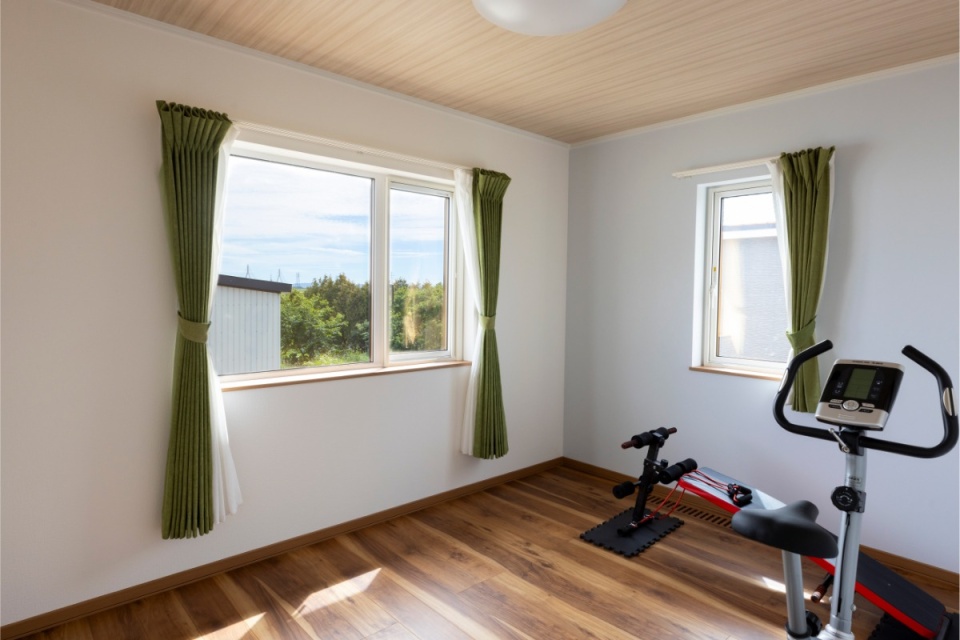 2階にはご夫婦の寝室のほか、洋室2部屋を設けました。うち1室はご主人のトレーニングルームに。奥さまは妊娠中で、残りの1室を子ども部屋として使う日ももうすぐです。