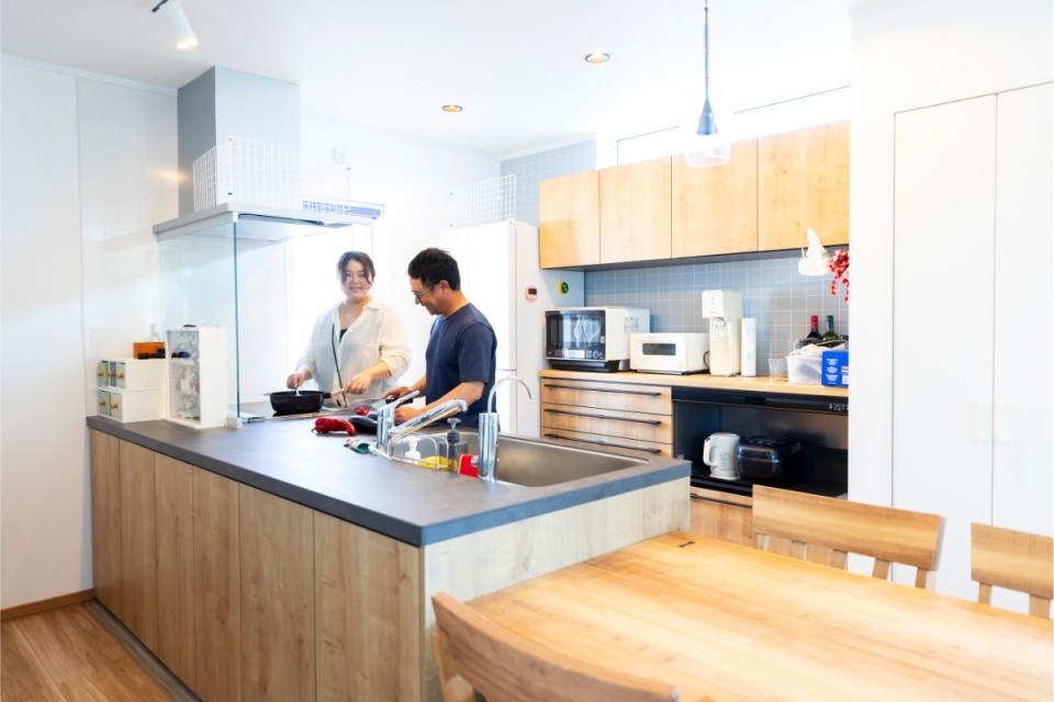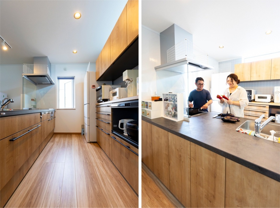 キッチンはリクシル製で、ご夫婦で一緒に立っても余裕のある間口の広さ。ともに料理や片付けをすることも多いそうです。