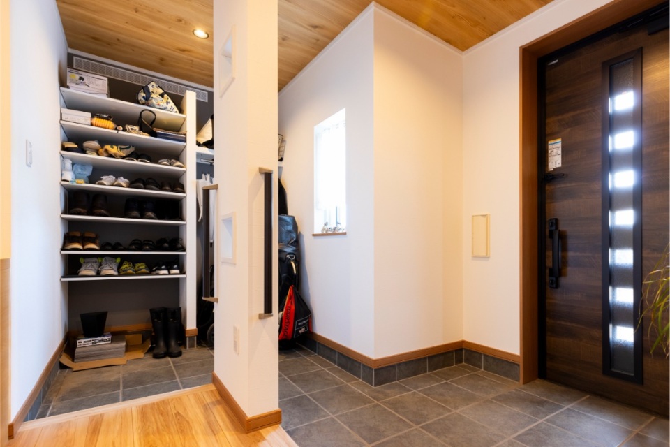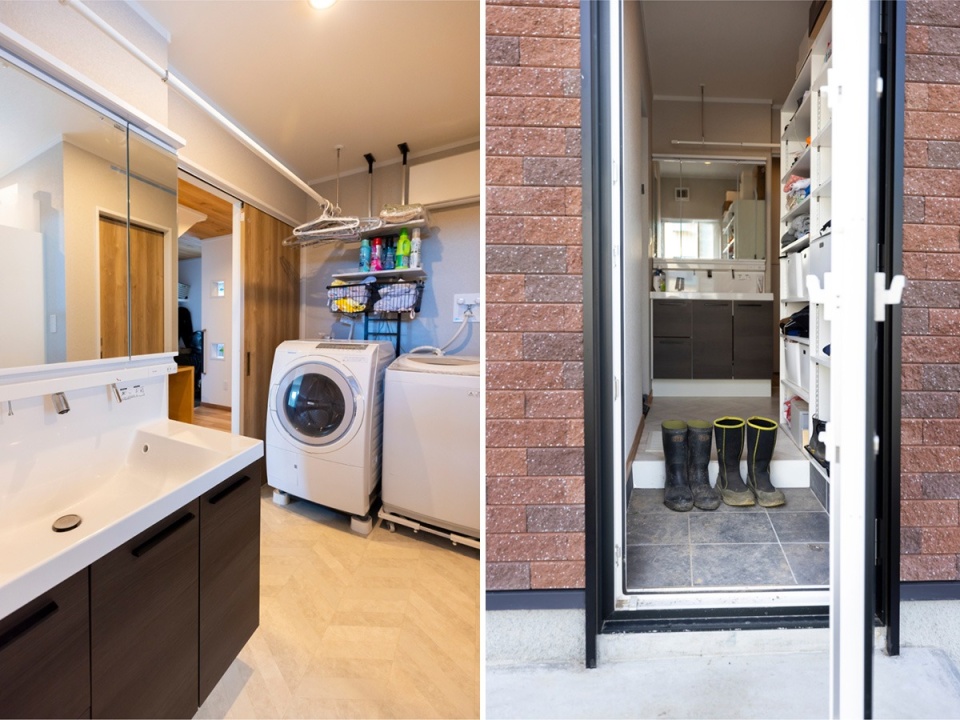 Tさんの家は玄関とは別に勝手口を設けた農家の住まいです。奥さまのご実家とともに農業を営んでおり、大豆や麦、ビートなどを育てる毎日。勝手口とともに、洗濯機2台を設置した洗面洗濯室も設けました。