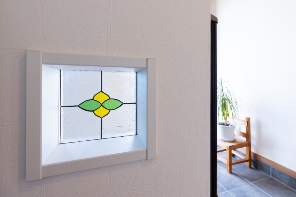 玄関を上がってすぐの場所にトイレがあります。ひび焼きのガラスのあかりが印象的です。
