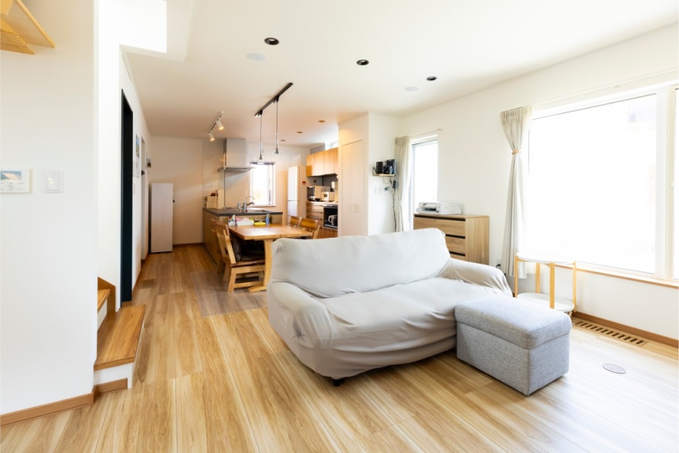 LDKは17.6帖あり、広々としています。窓は大きく開放感がありますが、緻密に断熱気密が考えられ、高性能トリプルガラスの窓を用いているため、冬のさ中の引き渡しでしたが、快適な暖かさの中過ごすことができました。