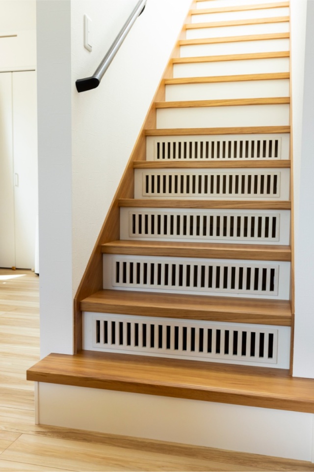 Tさんの家では、床下のエアコン1台のみで全館空調ができる方法を採用しました。2階に通じる階段の蹴込みには、暖められた空気を室内に届けるガラリが設けられています。