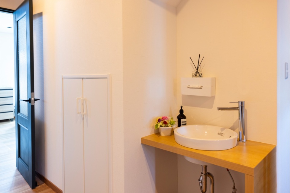 廊下には洗面台が。コロナ禍での家づくりだったため、玄関手洗いが設けられました。トイレ後の手洗い場も兼ねています。