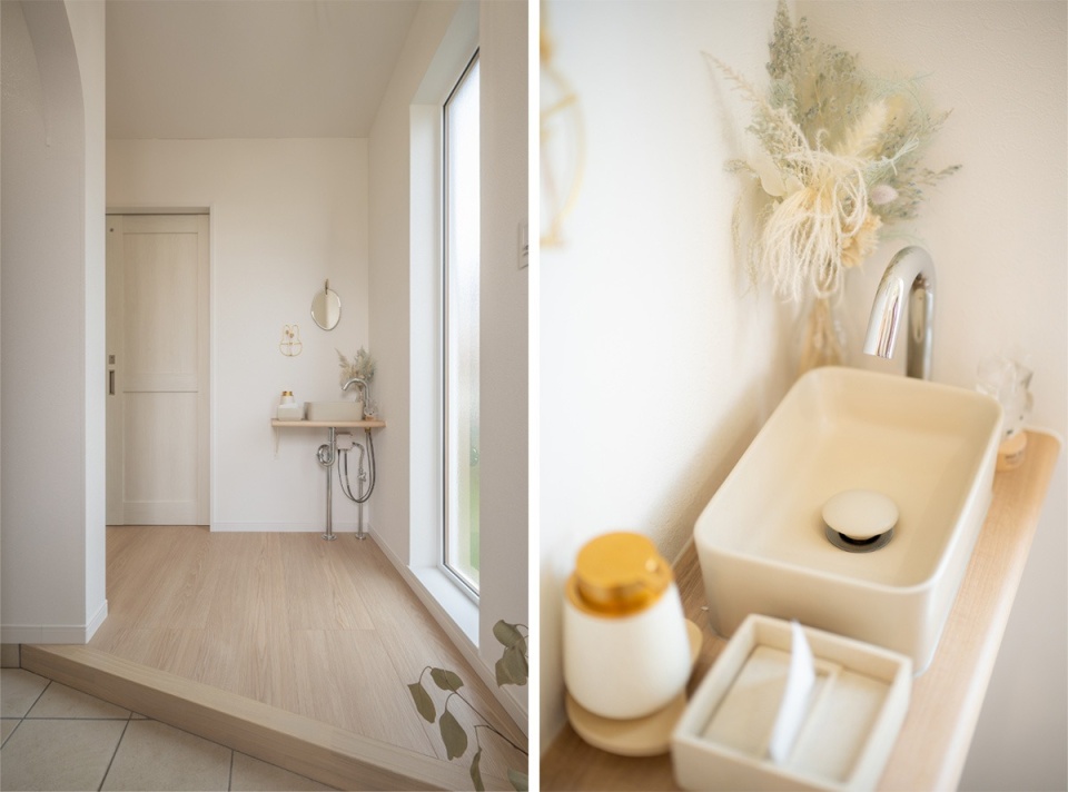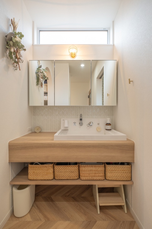 洗面化粧台は角を取って丸みのある天板に造作してもらっています。モデルハウスを見学してそうした造作ができることを知りました。雰囲気がやわらかくなり、子どもにもやさしい。そうした家づくりはとても素敵でおしゃれだなと感じました。