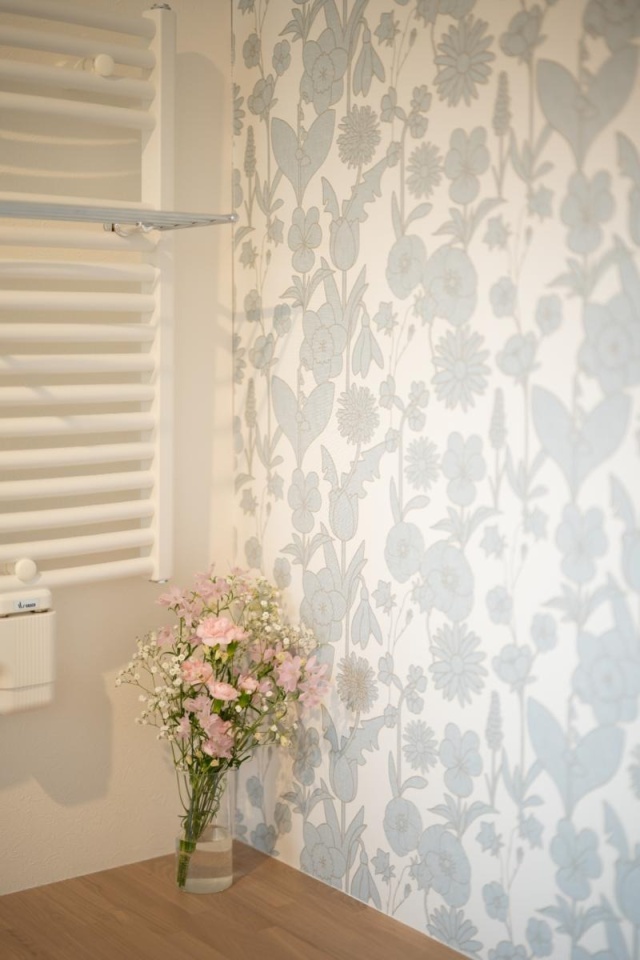 子ども部屋などは1面だけ違う色にしています。ちょっと冒険したのが脱衣室です。思い切って大柄の花のデザインの壁紙にしました。私の大好きなミッフィーの壁紙です。おかげで自分の好きな柄を眺めながら洗濯ものを畳んだりアイロンをかけたりできる、憩いの場になりました。