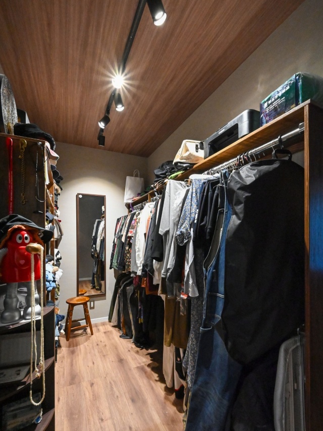 個室は、ご夫婦の寝室と洋室2部屋があり、寝室には脱衣室からも入ることができる約2帖のウォークインクローゼットも備わっています。レールライトに照らされたご夫婦の洋服が並ぶ様は、クローゼットではなくモダンな洋品店をイメージさせるほど素敵な空間に。