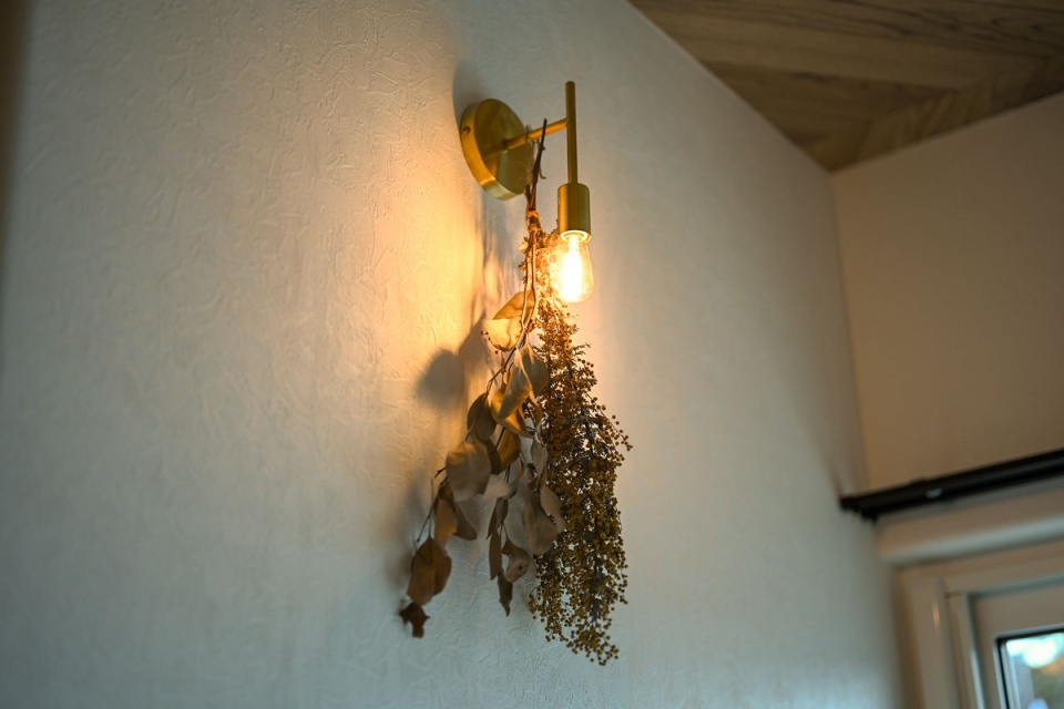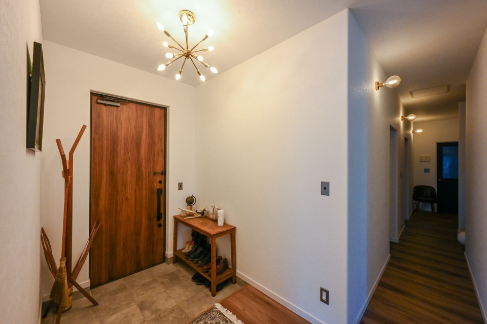 インテリアコーディネートに関しては、家具系を中嶋さん、クロス・照明関係を奥様が担当しており、特に玄関の照明は東京のアパレルショップで使われていたものを気に入って、いつか付けようと以前から考えていた製品。玄関から入ってきたときに、洗面化粧台のお洒落な照明がデコレーションウィンドウを通して見えるのも、奥様がこの住まいで気に入っているところの1つです。