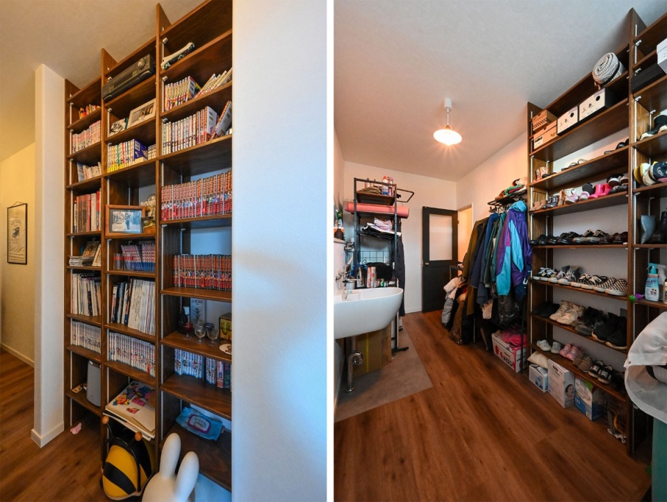 また、1階ホールには奥様が希望していた本棚を造作。天井までの高さがあり、奥様が好きなコミックなどもたくさん収納することが可能。さらにホールとインナーガレージの間にはストレージルームを設け、大容量の靴棚を造作するとともに、冬物のコート掛けや洗濯機、スロップシンクも設置しています。こちらに冬物のアウターや靴を収納することで玄関回りがスッキリしますし、奥様が農作業から戻ったときに汚れた作業服などもそのまますぐ洗えるのも大きなメリットです。