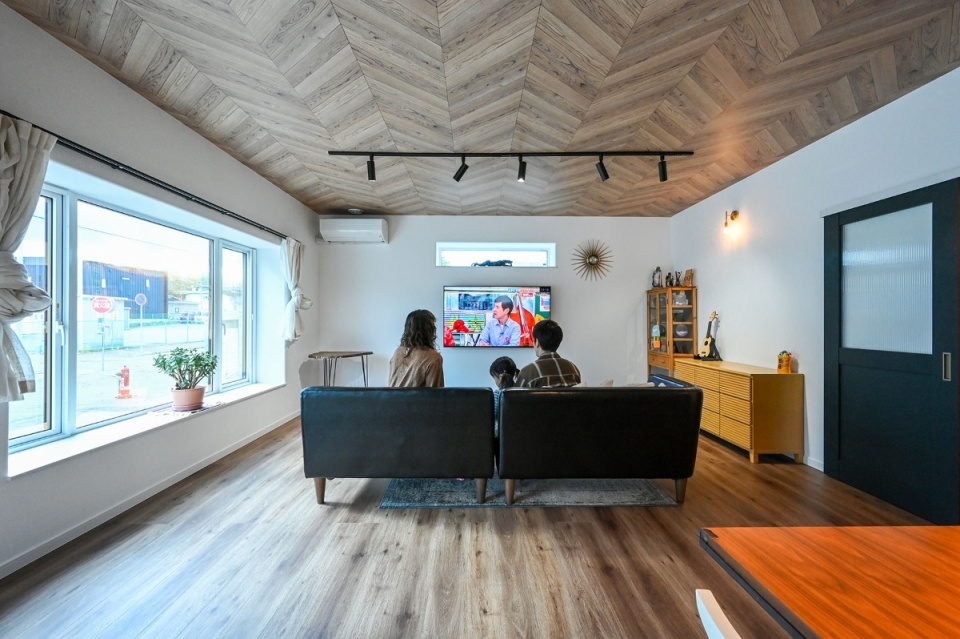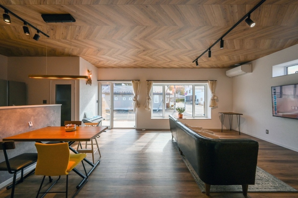 そして室内に入ると、“ヴィンテージモダン”なインテリアコーディネートが目を引きます。家族みんなの暮らしの中心となるリビング・ダイニングキッチンは、天井に使われているヘリンボーン柄のクロスが印象的。最初は床をヘリンボーン柄で仕上げたかったそうですが、いい建材がなかったため、インターネットでいろいろ調べた結果、天井にヘリンボーン柄のクロスを採用することに。建具や照明・カーテンレールのブラックが差し色となり、スイッチ・コンセントの金属プレートも相まって、理屈抜きに“カッコいい”と思わせる雰囲気をつくりあげています。