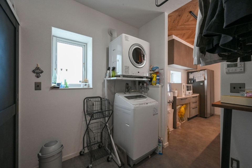 水回りをそれぞれ見ていくと、キッチンはすぐ横に1坪弱の広さがある食品庫も設けており、冬は外気を導入することで食品等の低温貯蔵を可能にしています。奥様は農作業も行っているので、野菜をもらうことも多いのですが、この大きさの食品庫があれば楽々保存しておくことができそう。キッチンに隣接するランドリールームには、ガス衣類乾燥機の『乾太くん』を設置しており、奥様は「ランドリールームに洗濯物を干すと、乾き具合が良くないこともあるので、『乾太くん』を付けておいて良かったです」と、とても重宝している様子。洗面スペースはモルタル仕上げのカウンターの上に洗面ボウルと幅広の大きな鏡を取り付けたオリジナル仕様となっています。