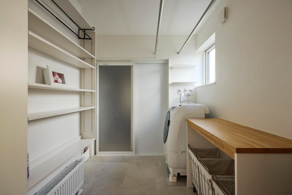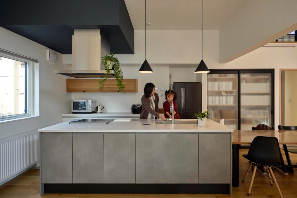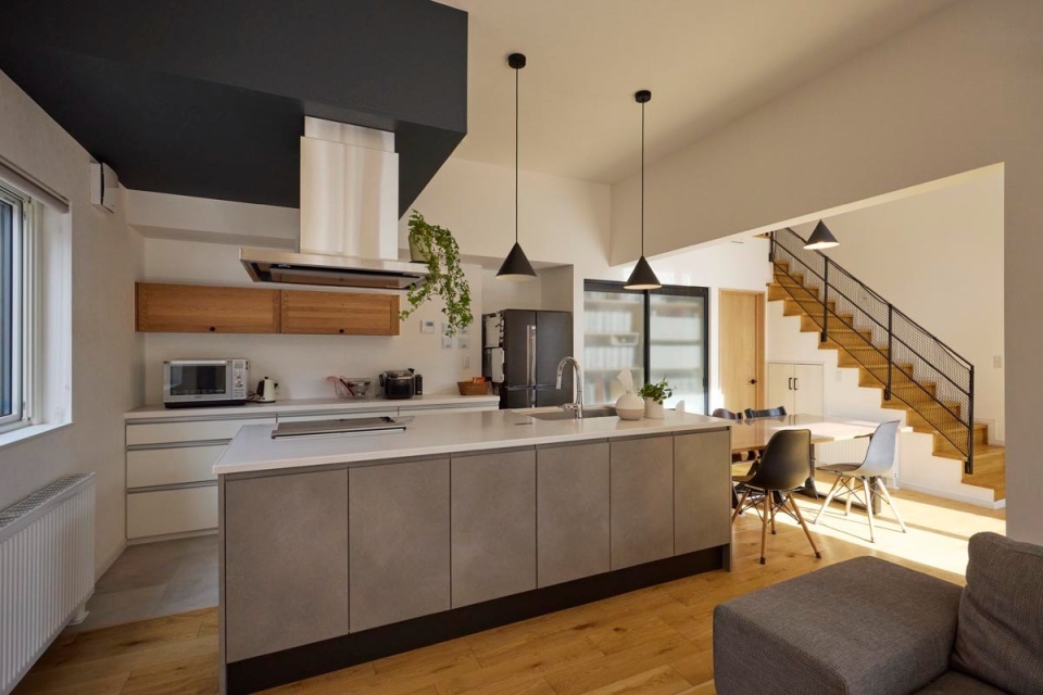 キッチンは、手元を隠す立ち上がりを付けるか迷った末にアイランド型を選択しました。「乱雑になりやすいワークトップを隠してくれる立ち上がりは便利ですが、利便性や実用性ばかりを求めるとどこか窮屈さを感じさせる家になってしまうことも。ここは空間の広がりを取りませんかと提案しました」と設計を担当した竹市社長。Oさんも「今はこのオープンな空間の気持ちよさを堪能しています。ワークトップが広いためお皿やお盆を置きながら作業することも可能で、食事の仕度もしやすいんですよ」と満足の仕上がりとなりました。