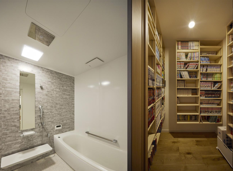 (写真右)造作の本棚が並ぶコミック部屋。宙に浮いたようなデザインは見た目の美しさだけでなく掃除のしやすさも兼ね備えています。