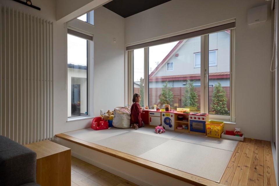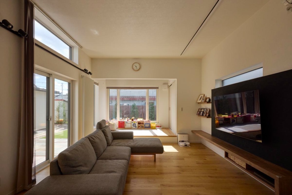 LDK内には小上がりを設けました。現在は主にキッズスペースとなっていますが、上部にはスクリーンを取り付け、必要な時にはゲストルームとしても使えるようになっています。