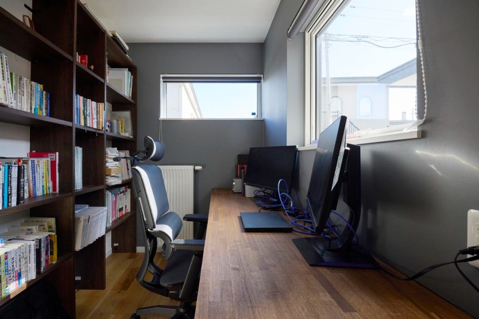 仕事関係の本が並ぶ書斎。グレーのクロスで落ち着いた空間に仕上げました。