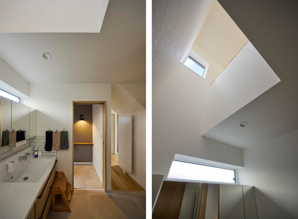 洗面所(写真左)は家全体の雰囲気に合わせ造作で作製しました。洗面台はタカラのアクリル人造大理石ハイバックカウンターを選択。水栓周りに水が溜まらないデザインで掃除のしやすさは抜群です。天井は一部吹き抜けになっており(写真右)、自然光が心地よい空間になっています。