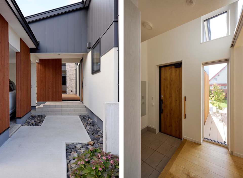 多様な質感と奥行きを感じさせるポーチ(写真左)に期待が高まります。明るい玄関ホール(写真右)からはシンボルツリーの楓の姿も。
