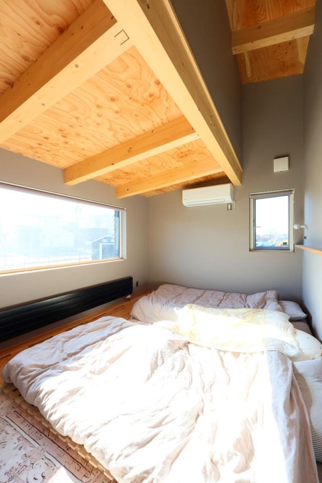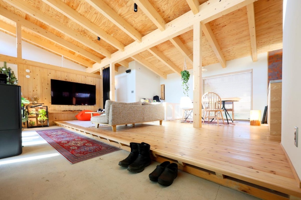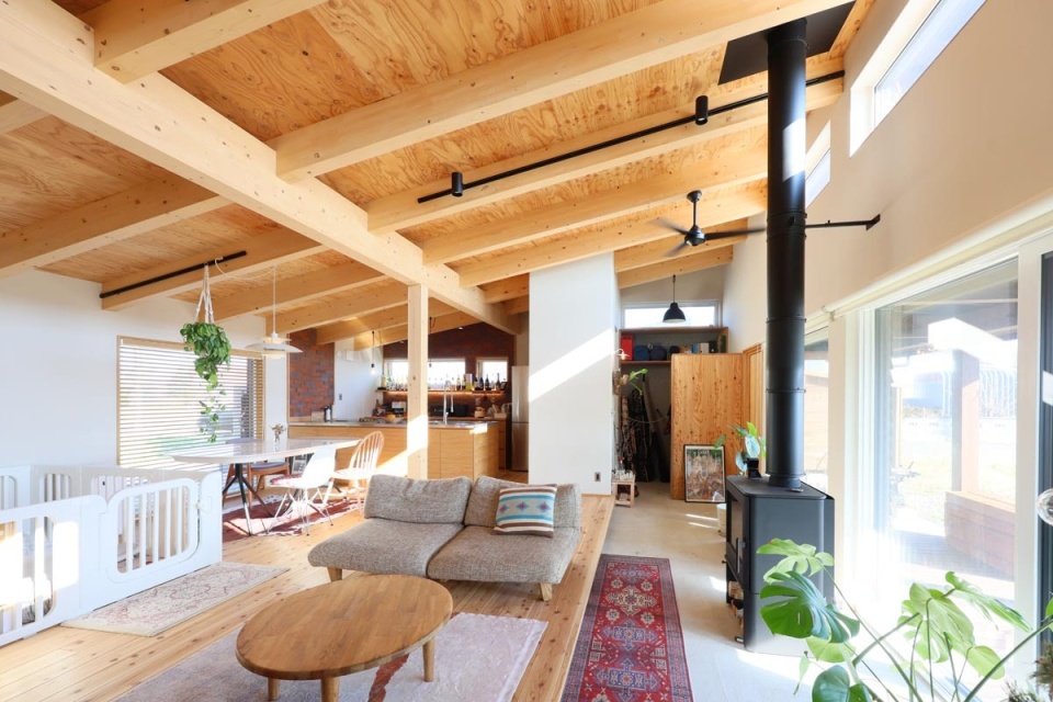 梁や天井が木の現しになっているのは、断熱材が構造躯体の外側にある「SHS工法」のメリットの一つです。この木の現しを丸三ホクシン建設のオープンハウスで見た2人は、ひと目で気に入ったと話します。