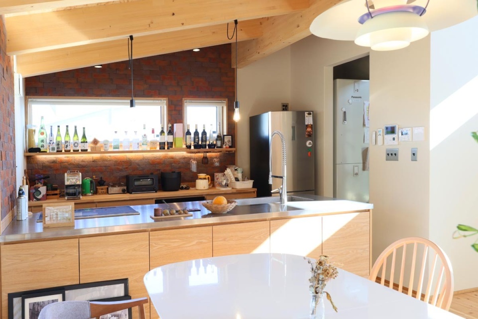 背面収納もキッチンに併せて製作。ワイングラスホルダー付きの背面の棚もお客様リクエストによる大工さんの造作。壁面の一部には江別のレンガタイルを使用しています。