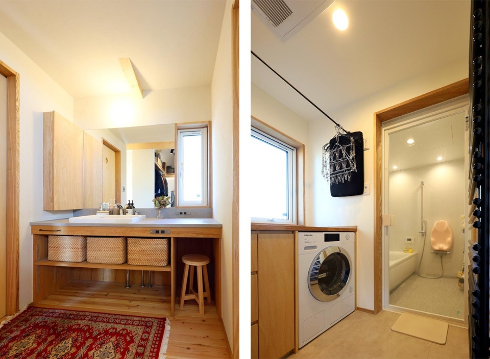 バスケットコートや薪ストーブ、書斎などいろいろありましたが、造作家具もその一つでした。キッチン以外も造作でできますよと聞いていたので、いろいろとお願しました。洗面室の洗面台や収納のほか、ユーティリティにはミーレの洗濯機を置きたかったので、それに合わせて棚を造ってもらいました。