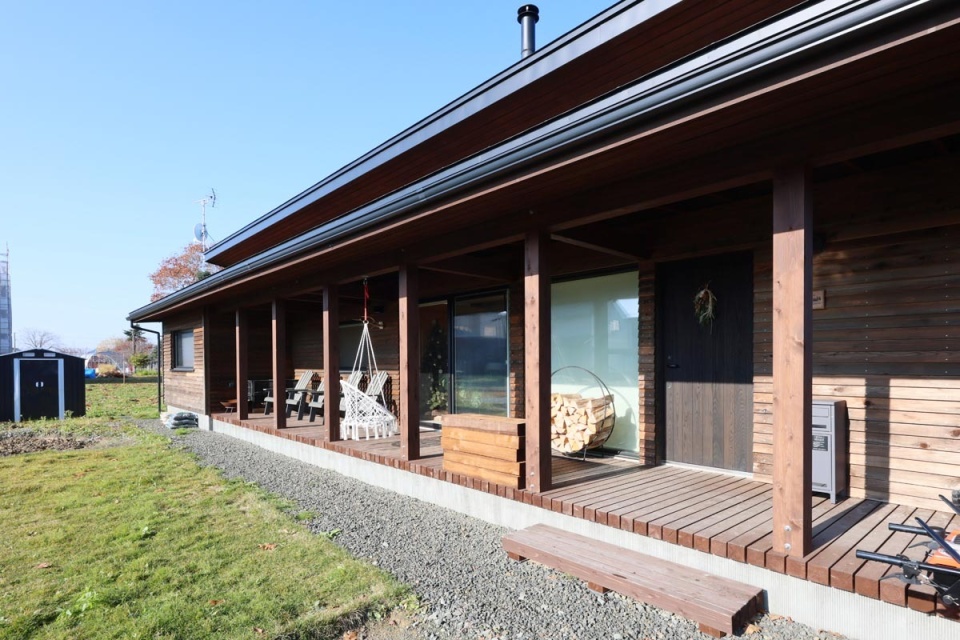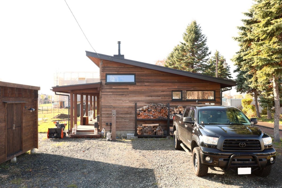玄関に近い外壁は、道南杉を横に配した板張りです。薪が置かれ、裏には松林があり、軒下には庭とつながるデッキ…まるでキャンプ場のコテージに来たような趣です。