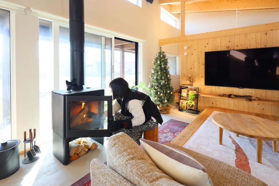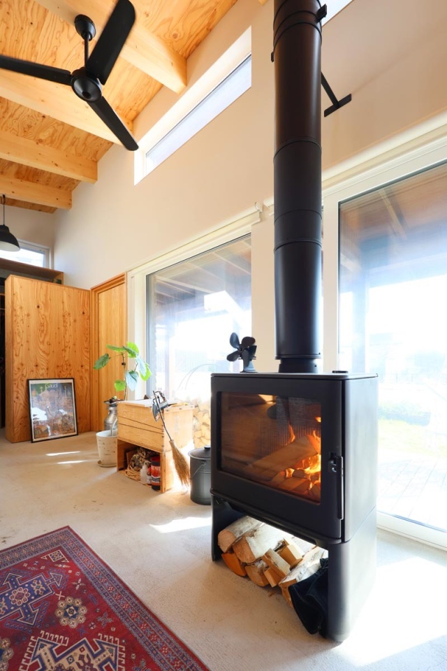 暖房はパネルヒーターと薪ストーブです。キャンプ好きなご夫婦にとって譲れなかったのが、薪ストーブでした。選んだのは、炎がきれいに見えるスペインのヘルゴン社製です。