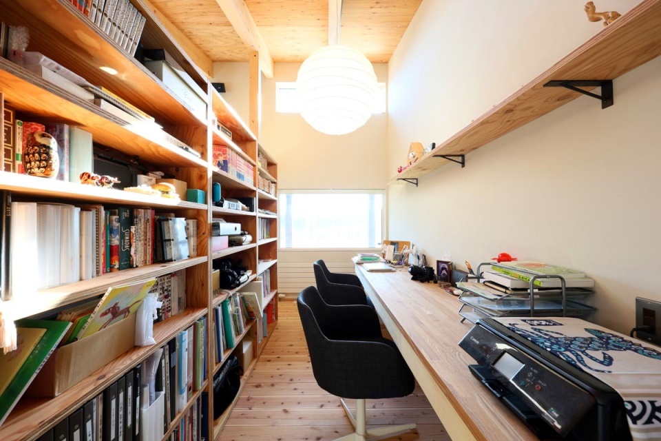 リビングの裏はご夫婦の書斎となっています。お互いに在宅で仕事をすることもあるため、集中できるようリビングとは本棚でへだて、落ち着いて仕事ができるスペースを作りました。本棚やテーブルも大工さんの造作です。