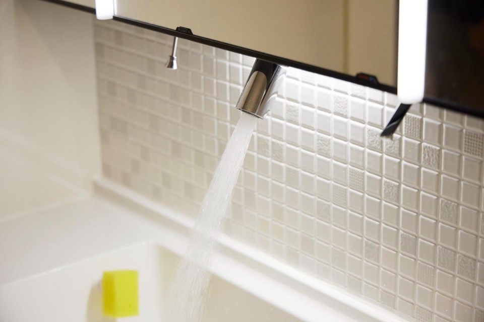 水栓からは「ウルトラファインバブル水」と呼ばれる微細な泡の入った水が。水道の元栓部分に機器を設置しているため、家中どこでもこの水が使えます。食器や身体を洗う際の洗浄力アップや入浴時の保温性の向上など様々な効果が見込めるそうです。