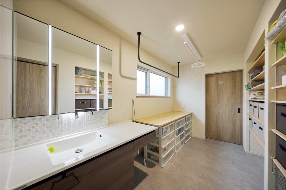 洗面台はLIXILの「ルミシス」。メイクや髭剃りのしやすいLEDライトつきで、水栓が上部についているので掃除がしやすいのも特徴です。洗面台の隣には干したものを畳める作業台を造り、洗濯から物干しなどの家事がまとめてできるようになっています。