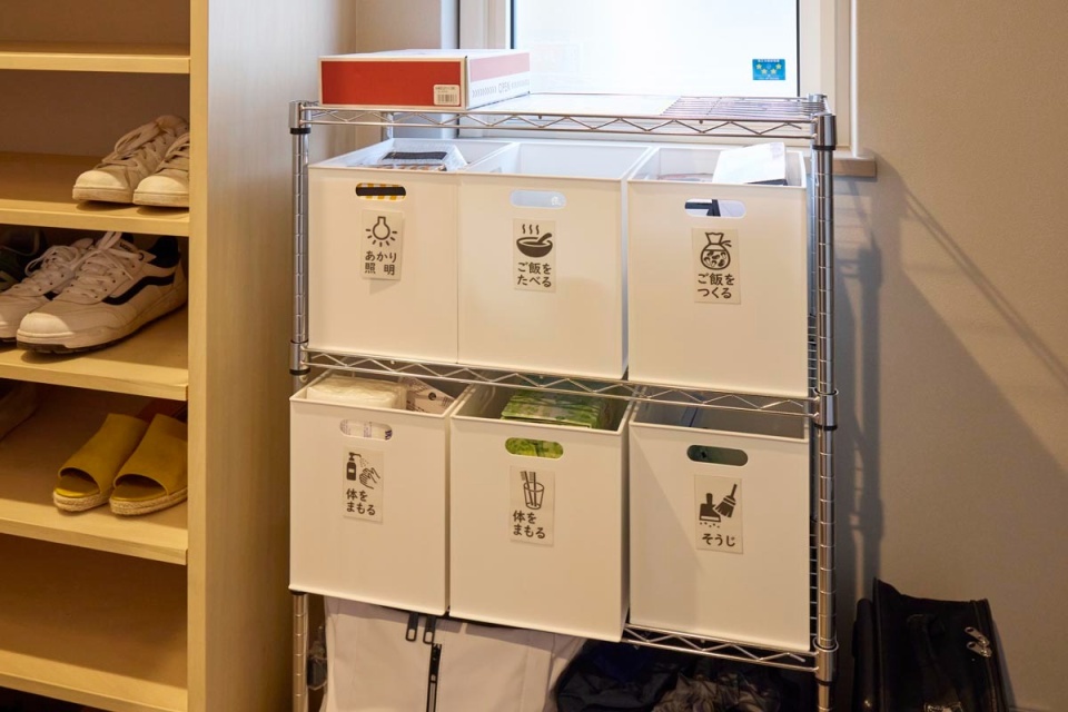 シューズクロークの中には防災士・徳本里栄さん監修の防災備蓄グッズが。非常時にも安心して暮らせます。