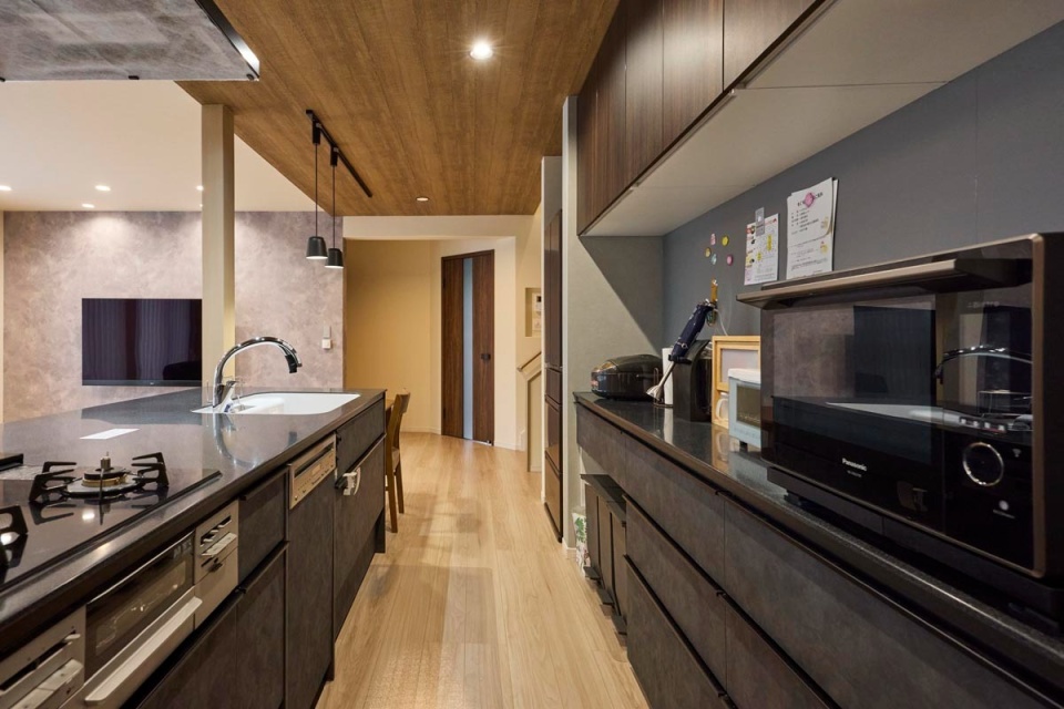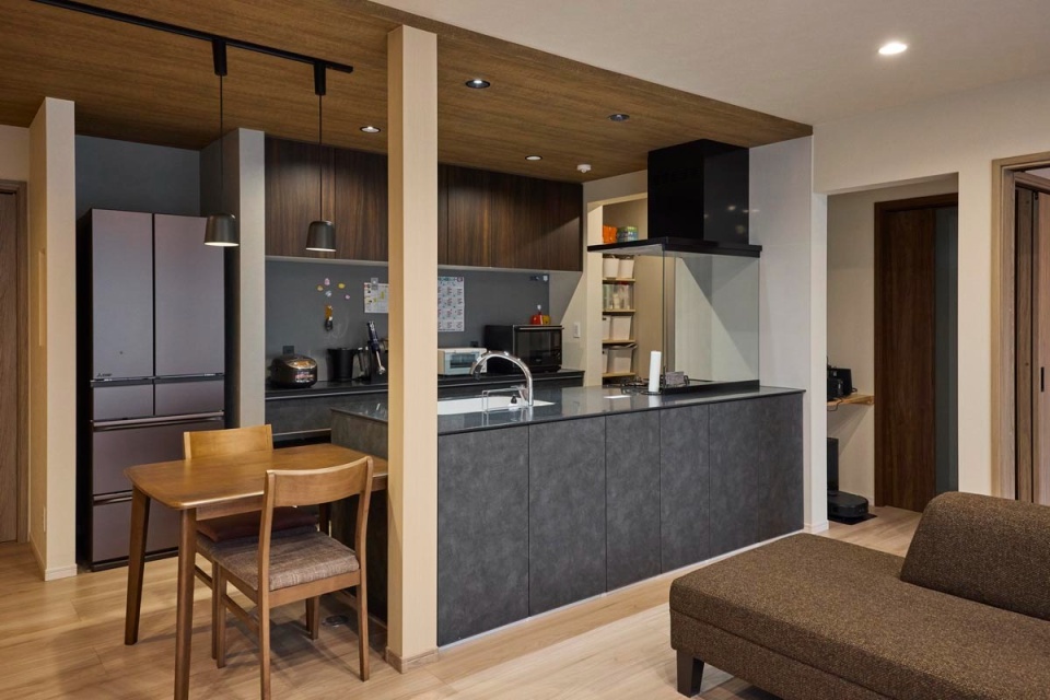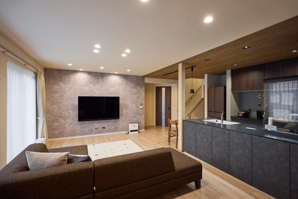 シックな色味でまとめたキッチンに、グレー系のアクセントクロスがモダンな印象のLDK。キッチンのわずかな下がり天井が空間のポイントになっています。