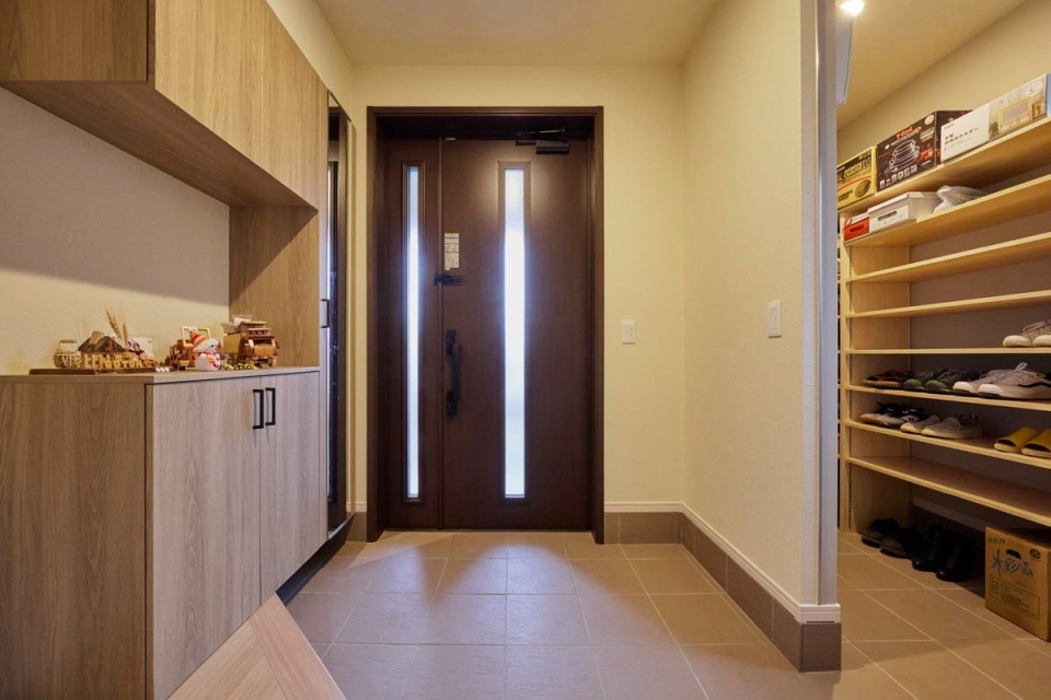 G邸には正面玄関と裏玄関の二つの玄関があります。こちらの表玄関は床暖房が入っており、冬場も濡れた靴が速やかに乾く仕様。隣のシューズクロークとの間は、来客時にはロールスクリーンで仕切れるようになっています。