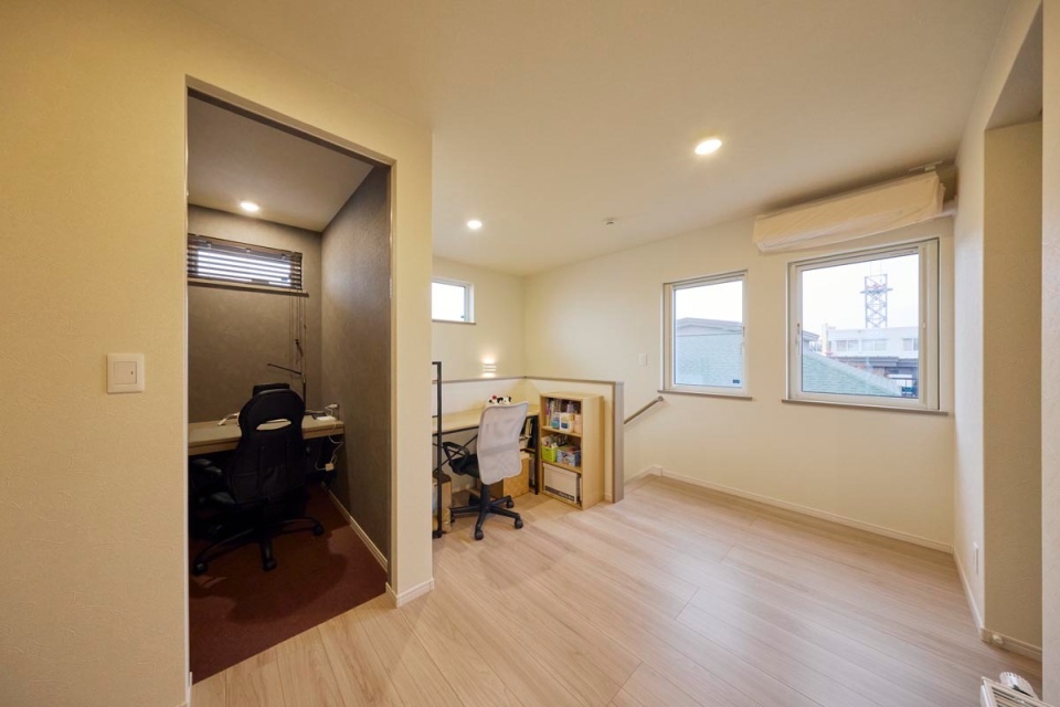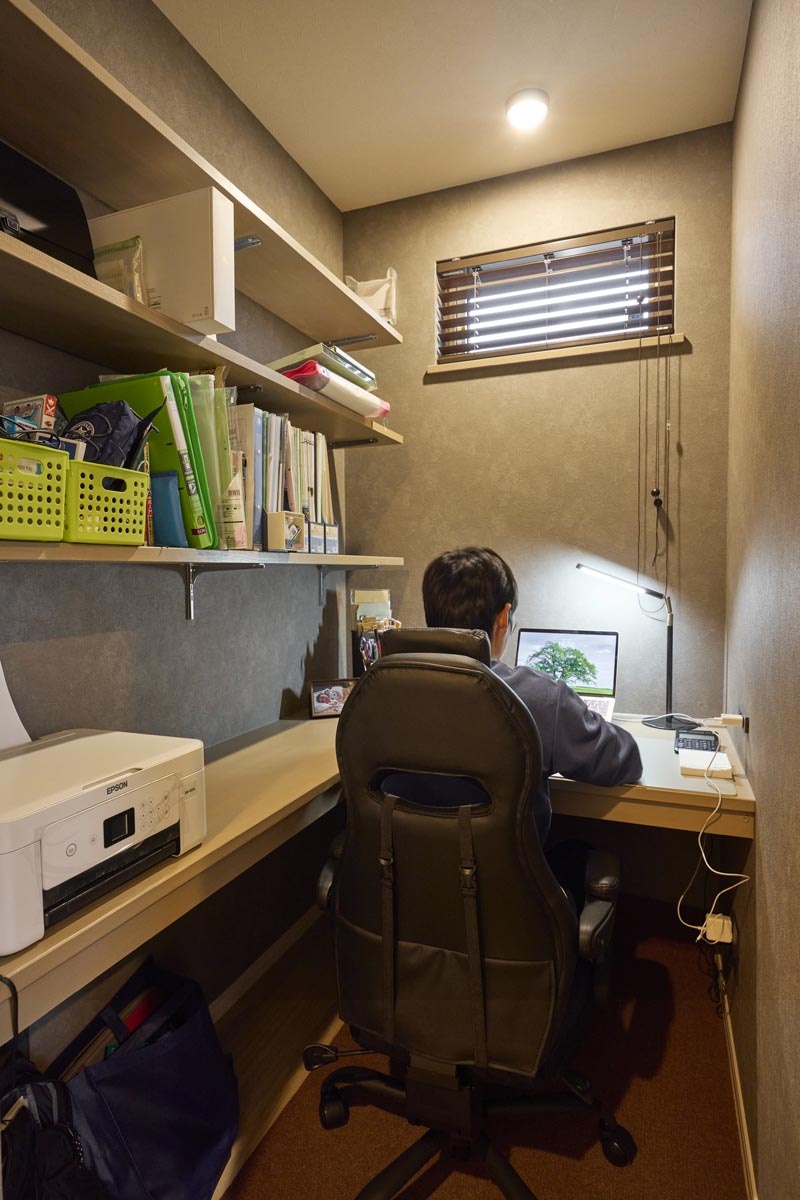 2階には子ども部屋の他に共用ホール内のデスクスペースと書斎を造りました。書斎にはL字型のデスクと棚を造作。コンパクトだからこそ使いやすい部屋になりました。