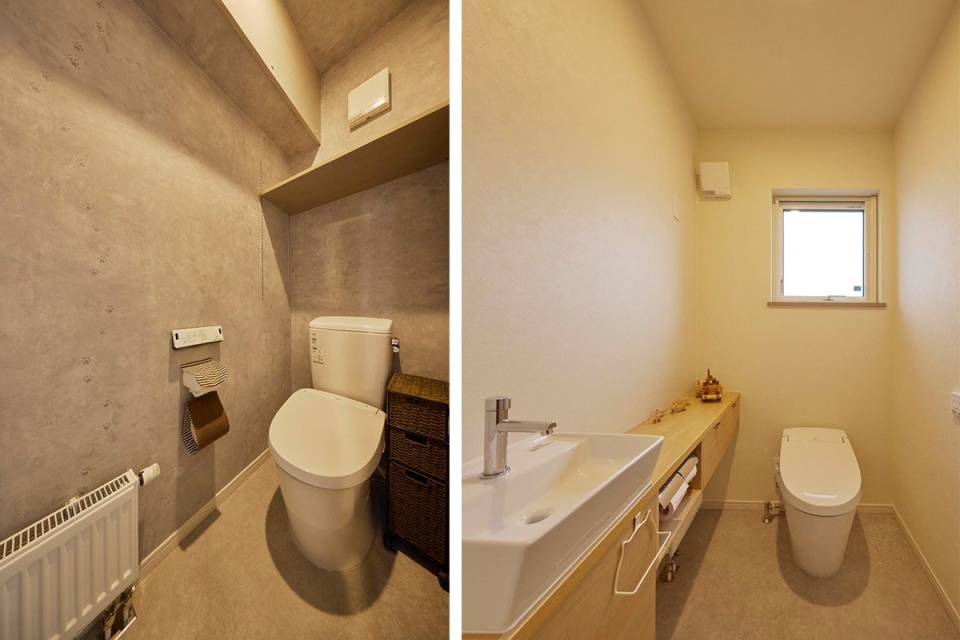 トイレの壁紙に採用した猫の足あと模様のクロス(写真左/リリカラ)は動物好きな奥様のお気に入りです。