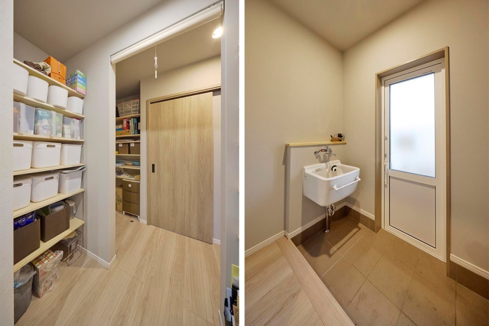 G邸の間取りは「正面玄関」「キッチン」「裏玄関(勝手口・写真右)」「脱衣・風呂・洗面所」がぐるりとつながった回遊式の設計です。汚れ物を室内に持ち込まないよう、裏玄関には土間部分にスロップシンクを設けました。