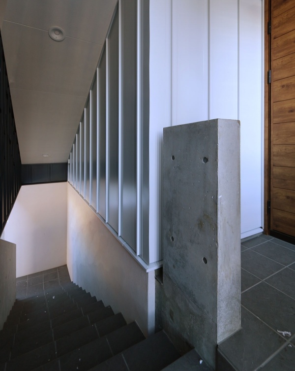 まず間口に玄関ドアが見当たりません。カーポートの横、階段を上って玄関ドアまで進むアプローチです。