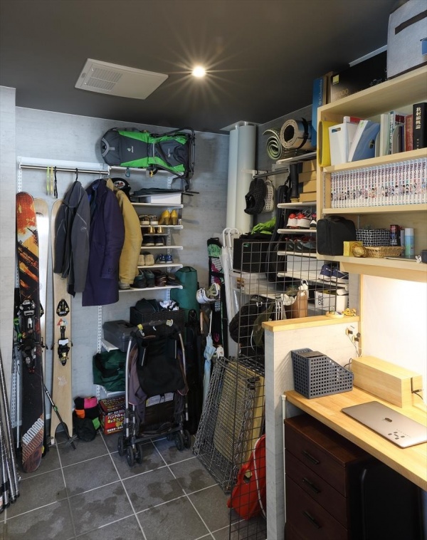 「登山とかスキーとか趣味がアウトドア系なので、朝早くや夜遅くでも家族を起こさずに身支度や後片付けをしたいな、と。用具がすぐに乾くよう土間に床暖を入れて、デスクも造作してもらいました。土間の書斎と洗面所と風呂とトイレがまとまってるので、僕はこの周辺だけで用が足りるようになっています」
