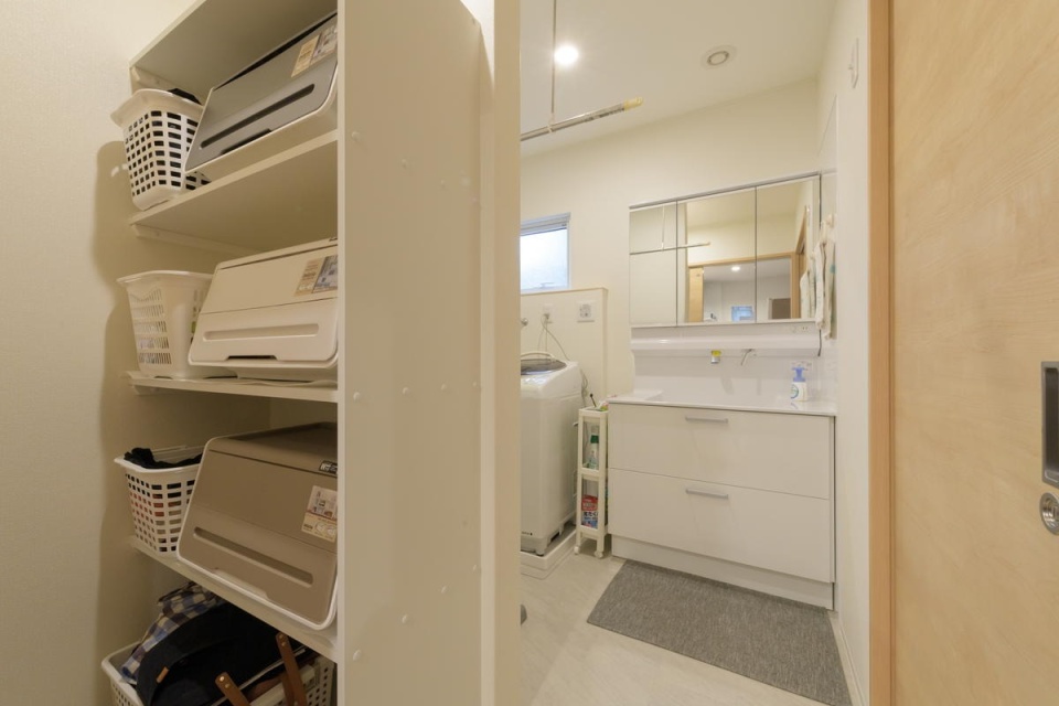 ユーティリティは、洗面横の洗濯機で洗濯して干す、乾いたら手前の家族用収納にしまうという時短動線。入浴は写真右の引き戸を開けると脱衣スペース、その奥にお風呂があるので、洗面やメイクと動線が重なる心配がありません。