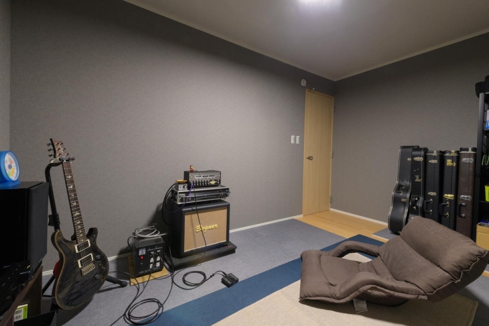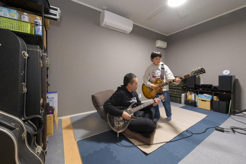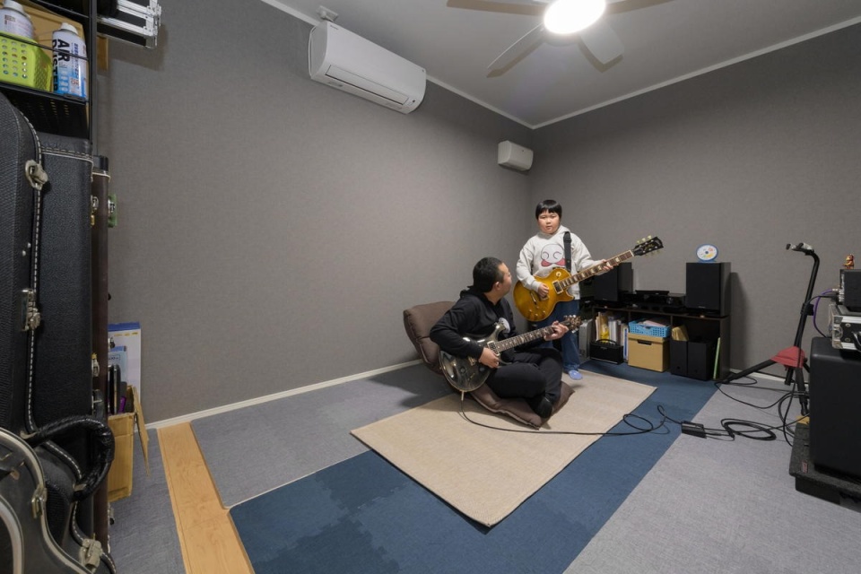 ご主人:防音室ならご近所を気にせず音楽を聞いたりギターを演奏することができます。音響機材をつなぐために200Vの専用コンセントも設置してもらいました。200Vから取ると音がいいといわれているんです。親子でセッションする楽しい時間が仕事の疲れをいやしてくれます。