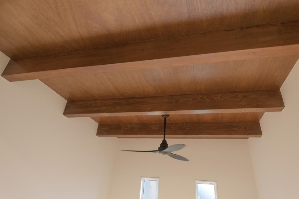 ご主人:まず一つ目は梁を現しにした吹き抜けです。シーリングファンが空気を循環してくれるおかげで、1階はエアコンひとつで快適です。梁の色合いは、村上さんにお任せしました。