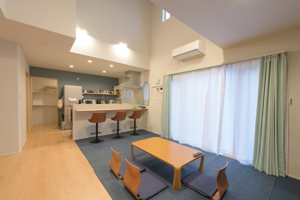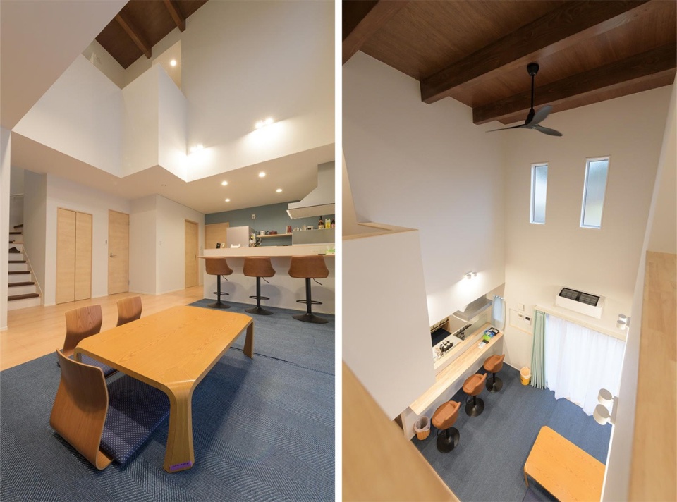 ご夫婦憧れの吹き抜けが、空間に広がりを生み出しています。シーリングファンもご夫婦の希望。ゆっくり回るシーリングファンを眺めていると「ほっ」と安らぐのだそう。多用途で活用できる対面キッチンにはカウンターも設えました。