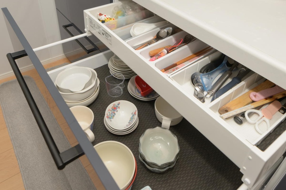 食器棚は置かずに、キッチン下の引き出しをフル活用し、食器やカトラリーを収納しています。わが家にとってじゅうぶんな収納力です。