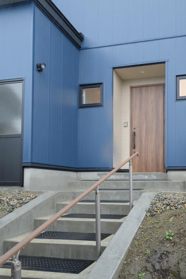 道路から最大2m高い敷地で、建物は道路からおよそ1m高い位置に建っています。道路に面して2台分のカーポート、そこから手すり付きの階段を登って玄関へと続きます。