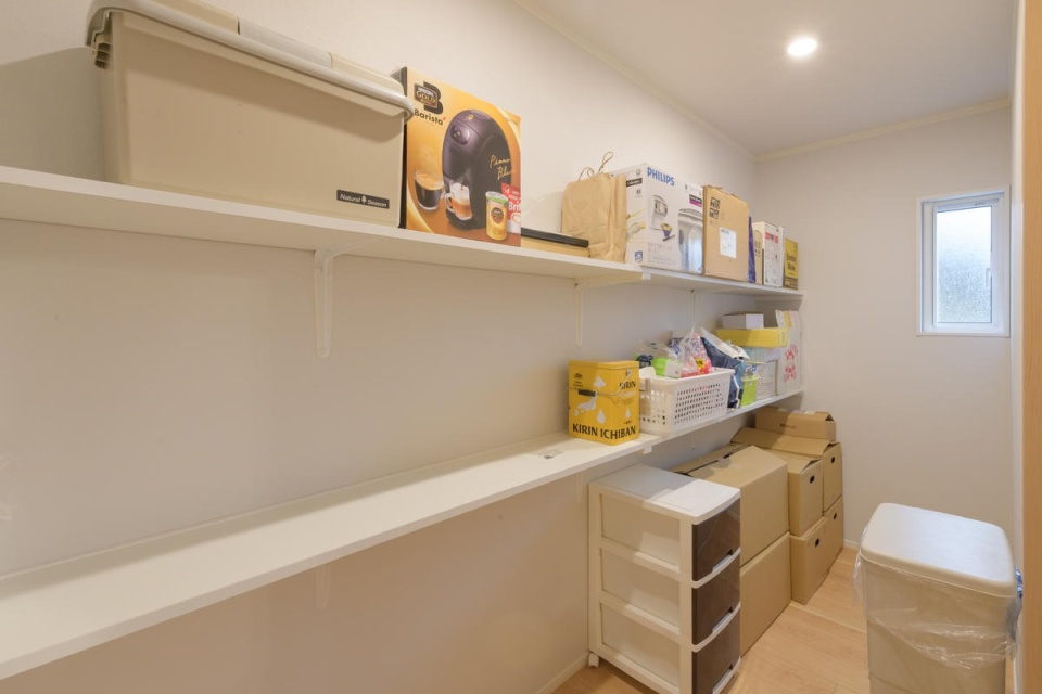 キッチンの裏につくったパントリー。広さがあるのでこれから食材をストックしたりと物が増えても安心です。