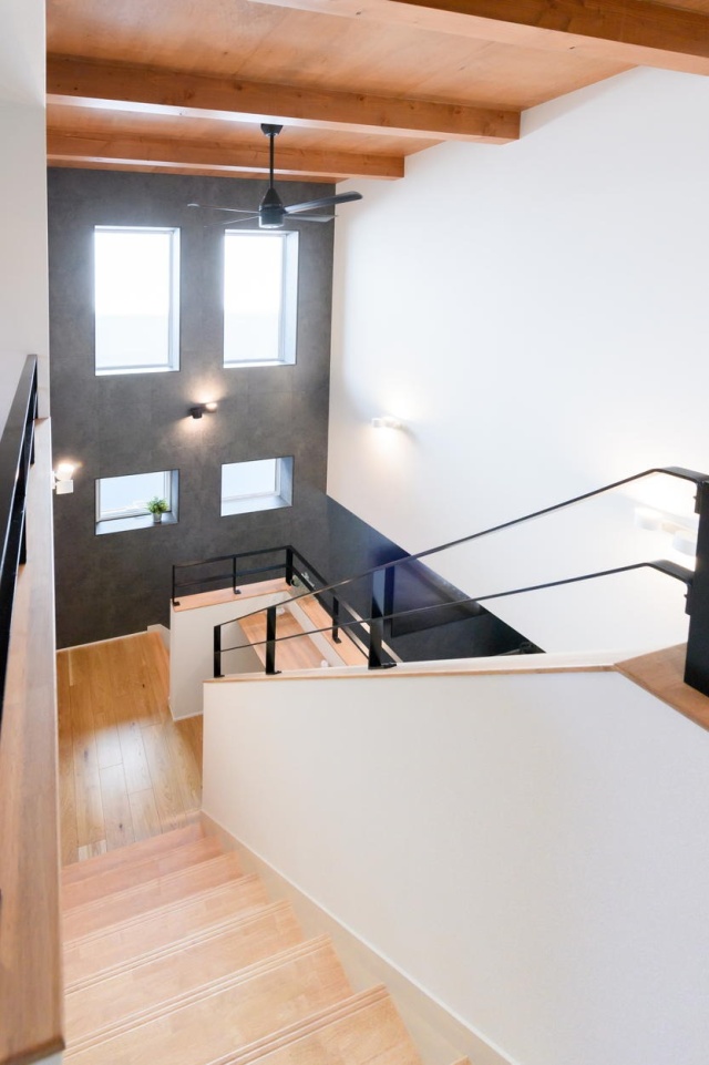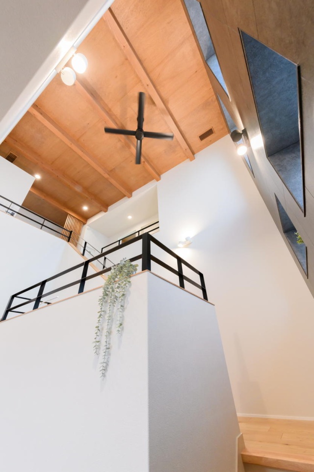 スキップフロアは4層になっていて、1階から2階を見上げると、吹き抜けの空間が広がり開放感があります。