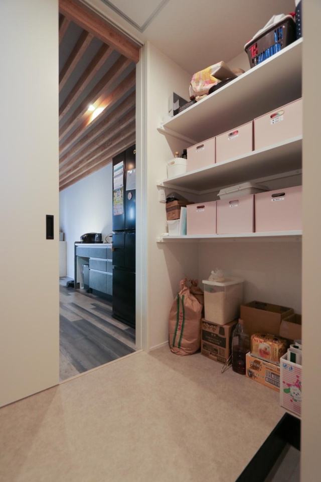 以前のアパート暮らしではモノの置き場所に苦労したという奥さま。玄関からパントリー、キッチンが続く使いやすい動線にもこだわりました。