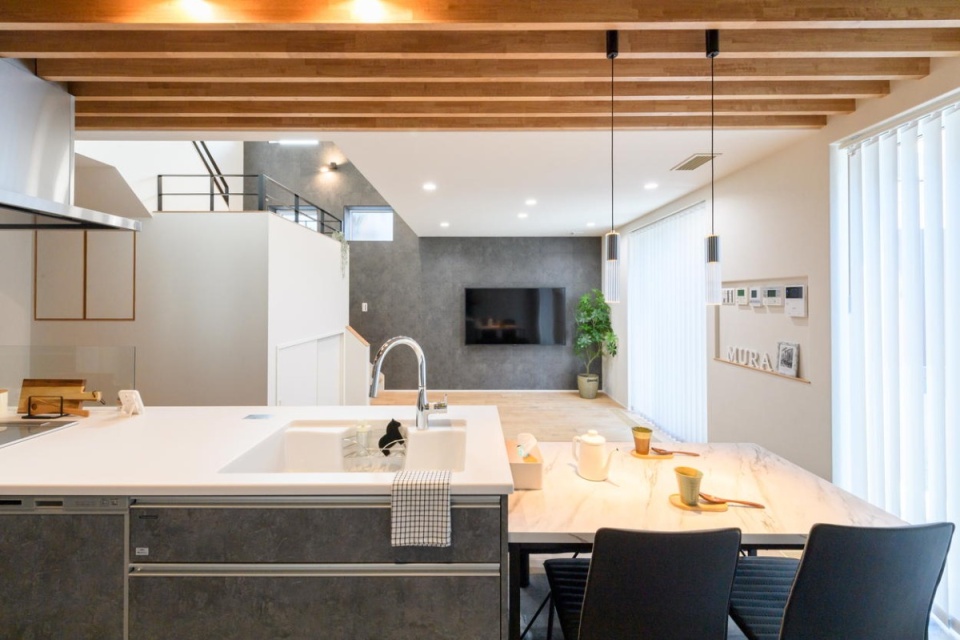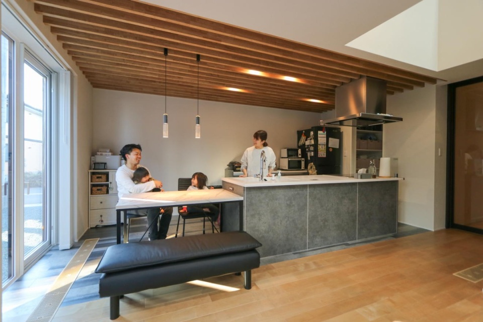 段差によって緩やかにつながるスキップフロアの間取りなので、キッチンに立っていてもダウンフロアで遊ぶ子どもたちや、書斎コーナーのご主人など、家族の気配が感じられます。