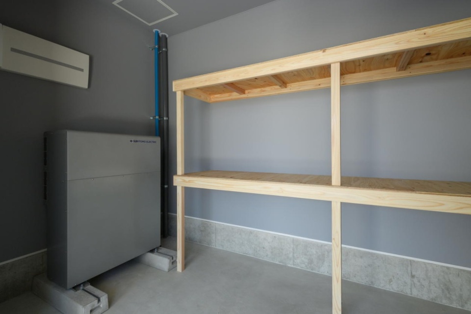 蓄電池はガレージ内部に設置しました。Nさんはこまめにチェックしていて、曇りの日でも蓄電池は70%近くたまっているそうです。夜間の電気は蓄電池で十分まかなえていると実感しています。