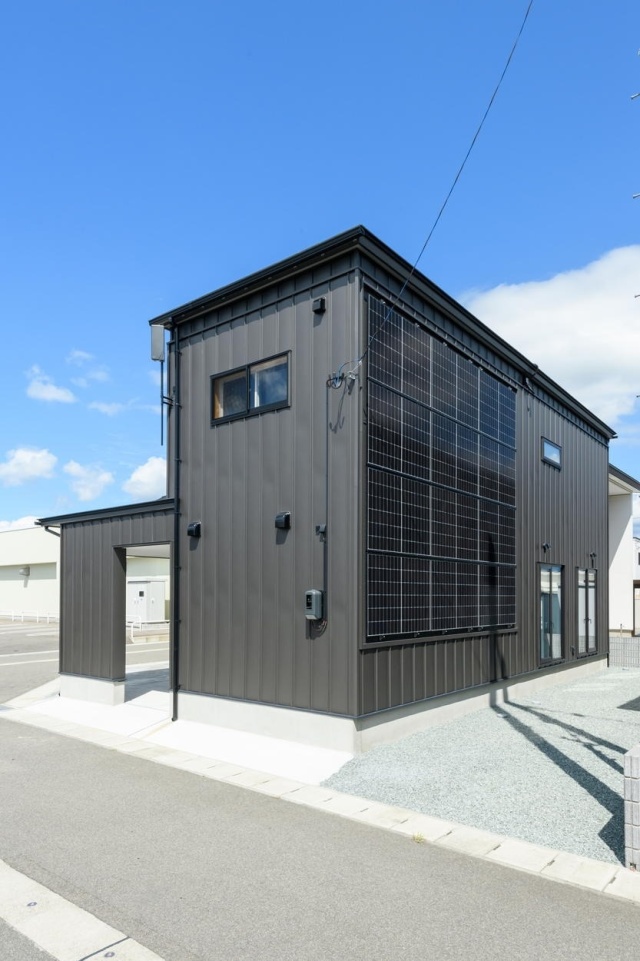 雪国・秋田は、冬に暖房で電気のエネルギーをたくさん使いますが、雪が降ると屋根に載せた太陽光パネルは発電してくれません。そこで、村上工務店は一年を通して安定的に発電できるよう、壁面に太陽光発電パネルの設置を提案しました。
