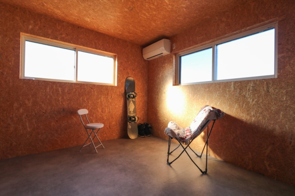 ここは2階にあるフリースペースです。1階ガレージから直接上がることもできます。構造用パネルOSBを現しにして使い、素朴でアウトドアな雰囲気に。やがてNさんの趣味部屋にする予定です。