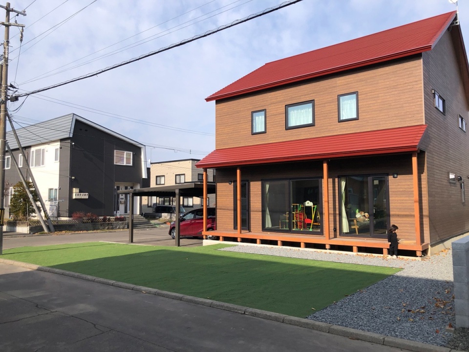 ここは北広島市の静かな住宅地。赤い三角屋根と横張りの外壁サイディングの家がT邸です。
